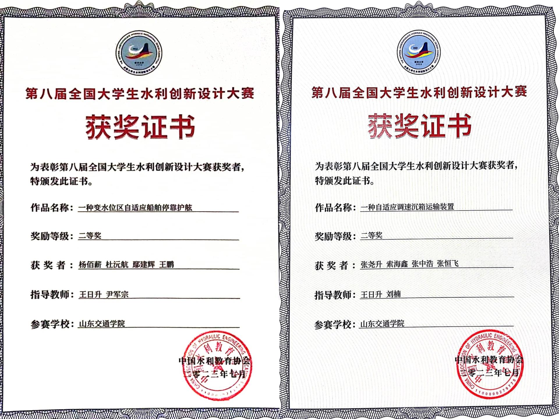 近日,第八届全国大学生水利创新设计大赛落下帷幕,交通土建工程学院学生作品《一种变水位区自适应船舶停靠护舷》《一种自适应调速沉箱运输装置》均荣获全国二等奖。