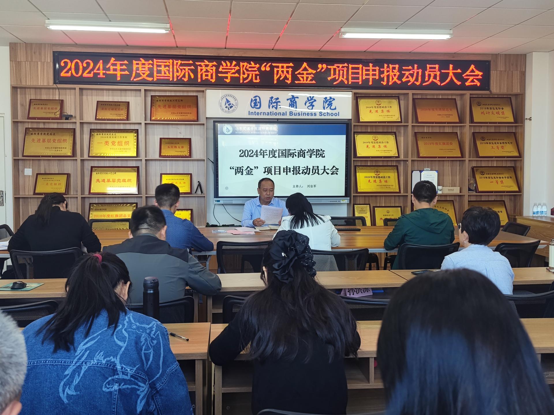 国际商学院召开2024年度国家“两金”项目申报动员会。学院党委书记刘佳军总结了学院2023年“两金”项目申报情况,传达了学校关于2024年“两金”项目申报工作的部署安排,详细解读了《国际商学院2024年度“两金”项目申报工作推进方案》,并鼓励教师结合近年来出现的新变化、新特点和新趋势,精心选题、提早准备、细心凝练,争取在2024年“两金”项目申报中取得新的突破,切实提高学院项目申报立项率。