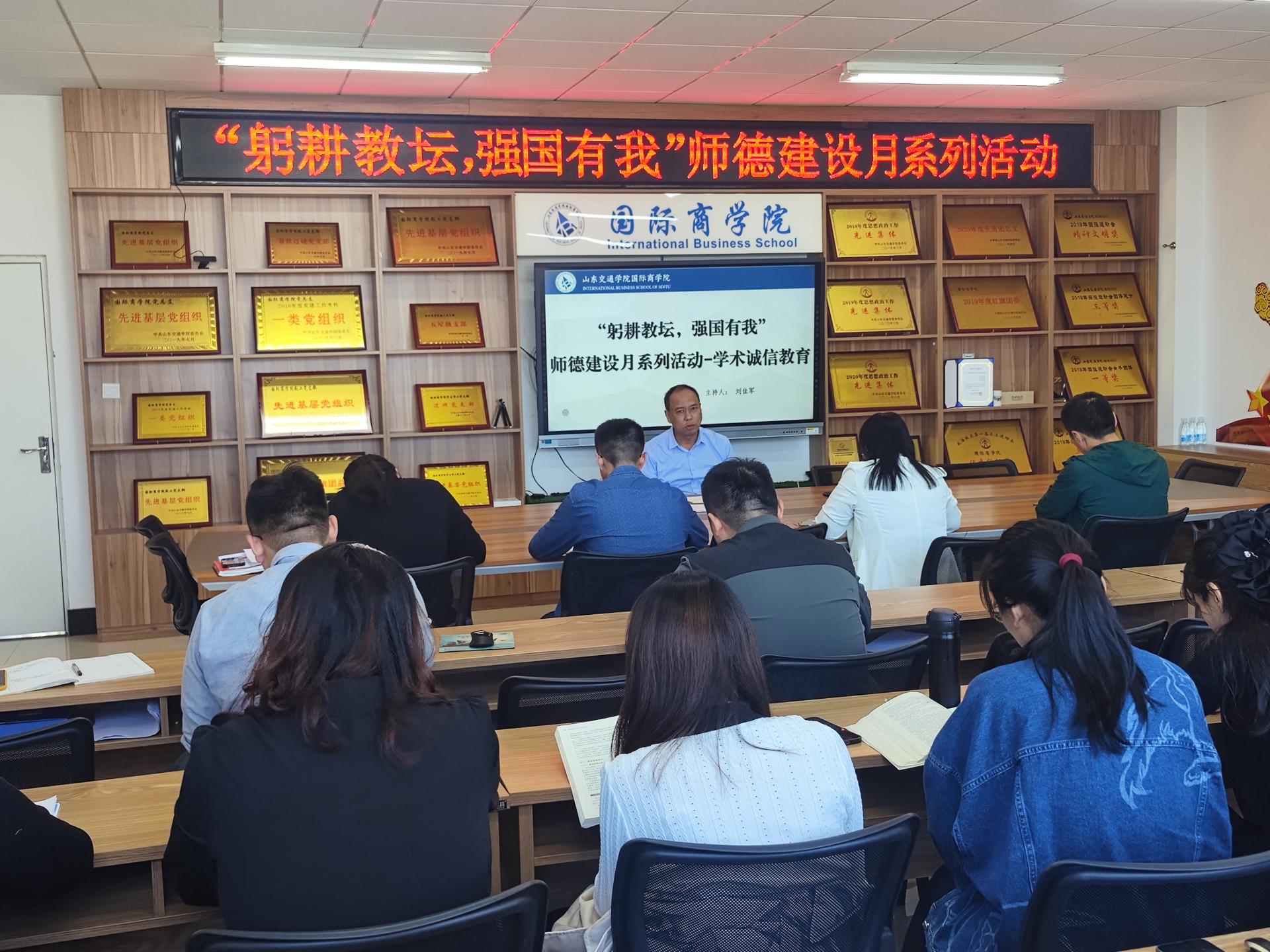 国际商学院开展“躬耕教坛,强国有我”师德建设教育活动。活动中,学院党委书记刘佳军带领全体教师集体观看《金牌思政课——弘扬西迁精神,到祖国最需要的地方建功立业》,并强调,各位教师要以满腔热情投入到教育科研事业中,踏踏实实做事,兢兢业业教学,在平凡的岗位上做出不平凡的成绩;全体教职工集体学习《新时代高校教师职业行为十项准则》。现场还举行了“山东交通学院国际商学院科研诚信承诺书”签名活动。