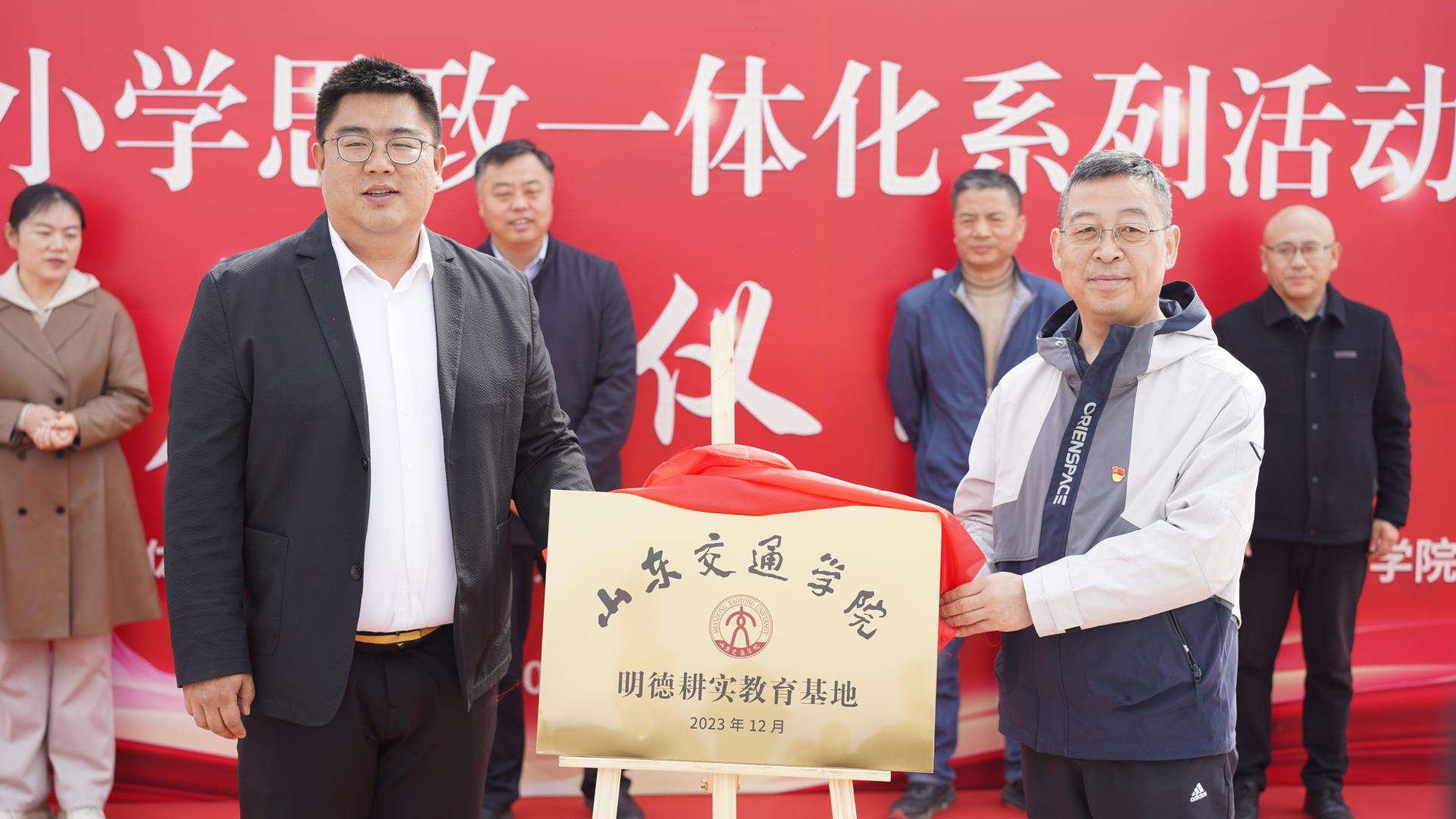 在启动仪式上,王培震结合生动事例讲述“思政微课”;于翊广介绍了学校近年来思政一体化建设研究推进情况,并诚挚邀请中小学生走进山东交通学院,体验交通文化;张守华介绍了山东女子学院旅游学院的专业建设和劳动教育特色;解超介绍了济西国家湿地公园建设情况。于翊广与解超共同为山东交通学院明德耕实教育基地揭牌。