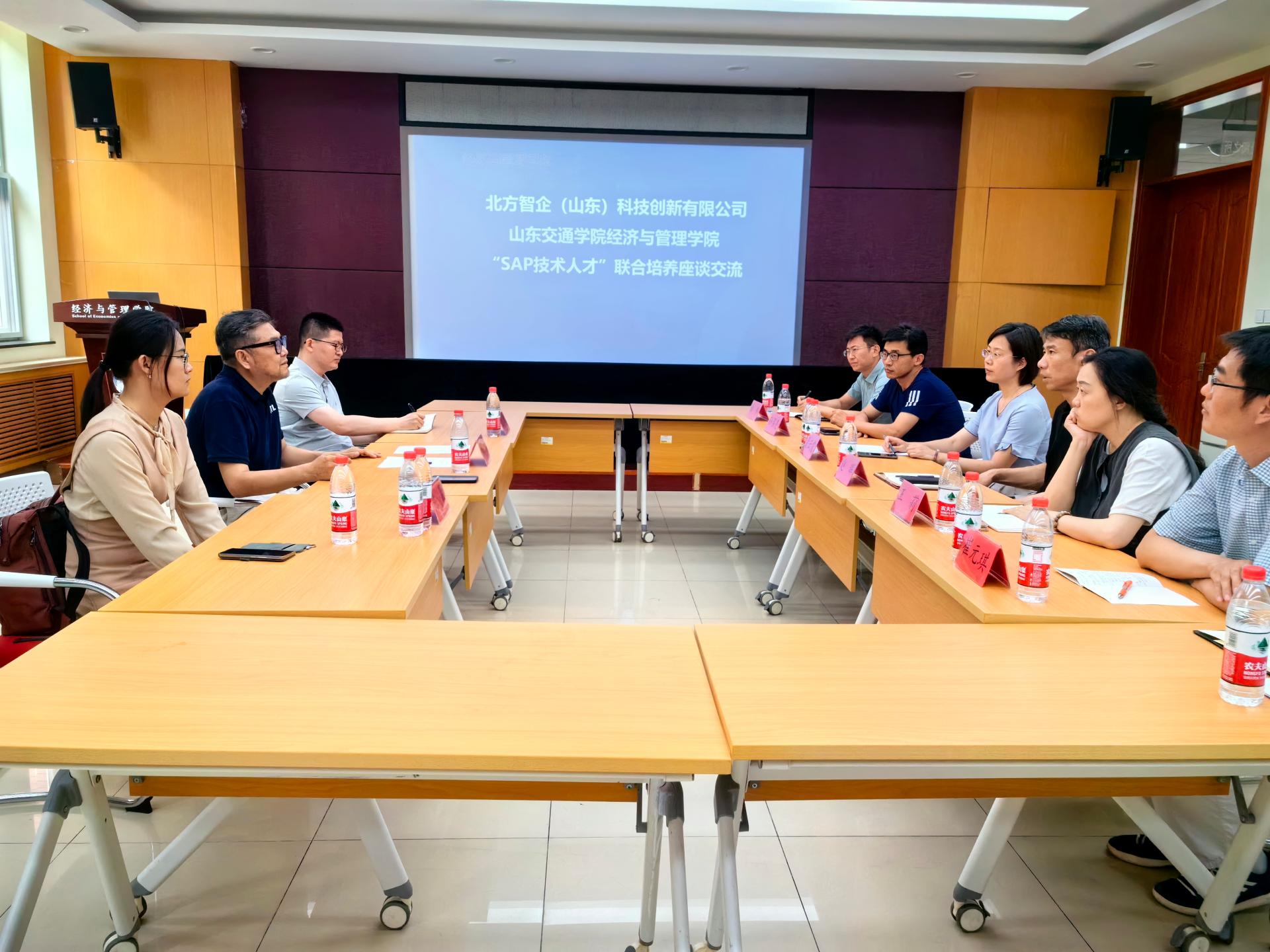 5月29日,经济与管理学院与北方智企(山东)科技创新有限公司在长清校区1B104会议室举行“SAP技术人才”(Systems Applications and Products in Data Processing,思爱普)联合培养座谈交流会。北方智企(山东)科技创新有限公司总经理荀伟、山东人才发展集团教育咨询有限公司职业教育部负责人王赞参加会议,学院党委书记赵晖主持会议。