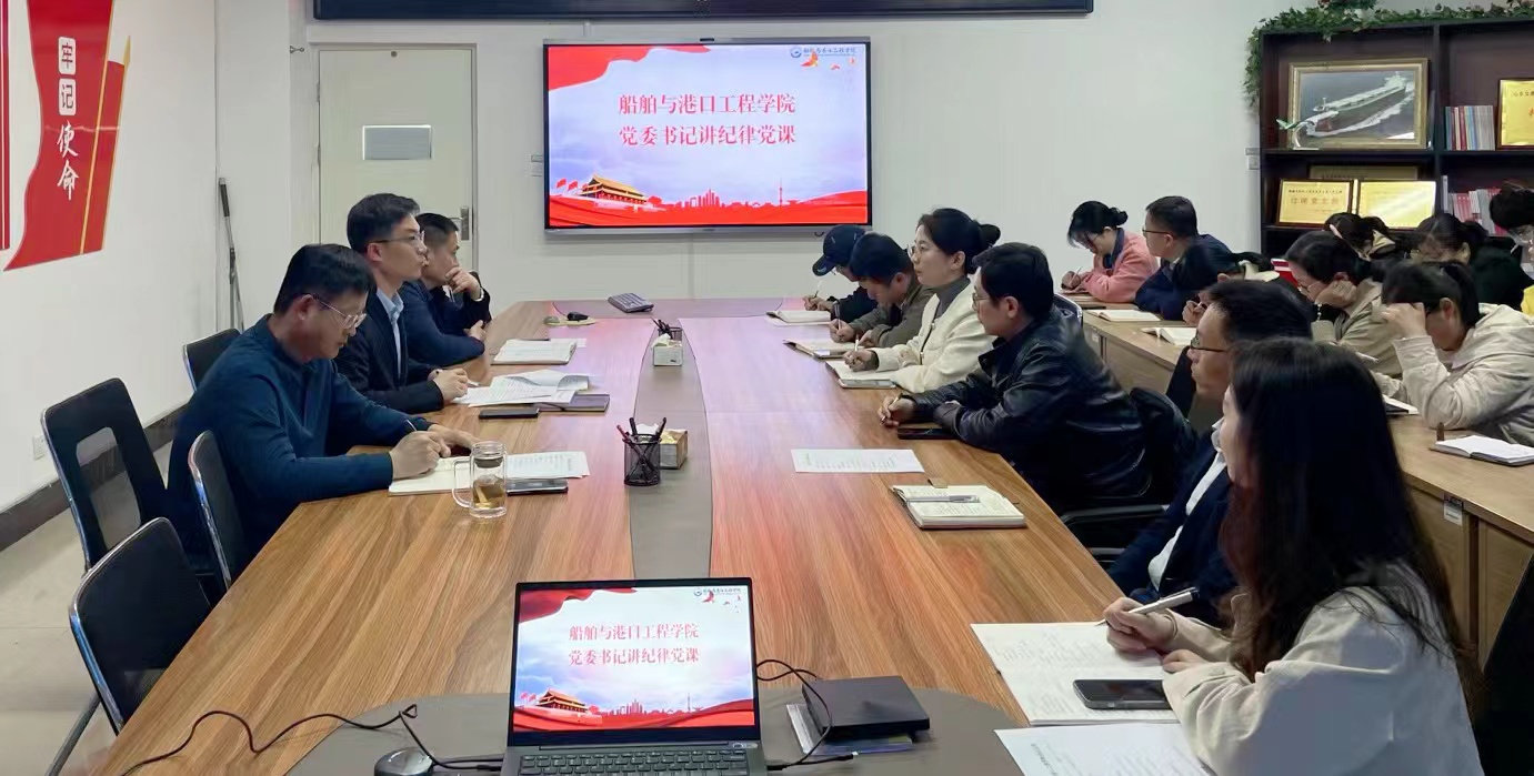 船舶与港口工程学院党委书记隋翀以《为奋进新征程提供坚强纪律保障》为题为学院全体教师党员讲授纪律党课。他聚焦新修订的《中国共产党纪律处分条例》(以下简称《条例》),结合具体案例,重点阐述了《条例》的修订意义、突出特点以及《条例》对推进全面从严治党向纵深发展的重要作用,并从坚持提高思想认识、坚持高质量高标准、坚持两手抓两促进等三个方面提出在学院开展党纪学习教育的目标要求。
