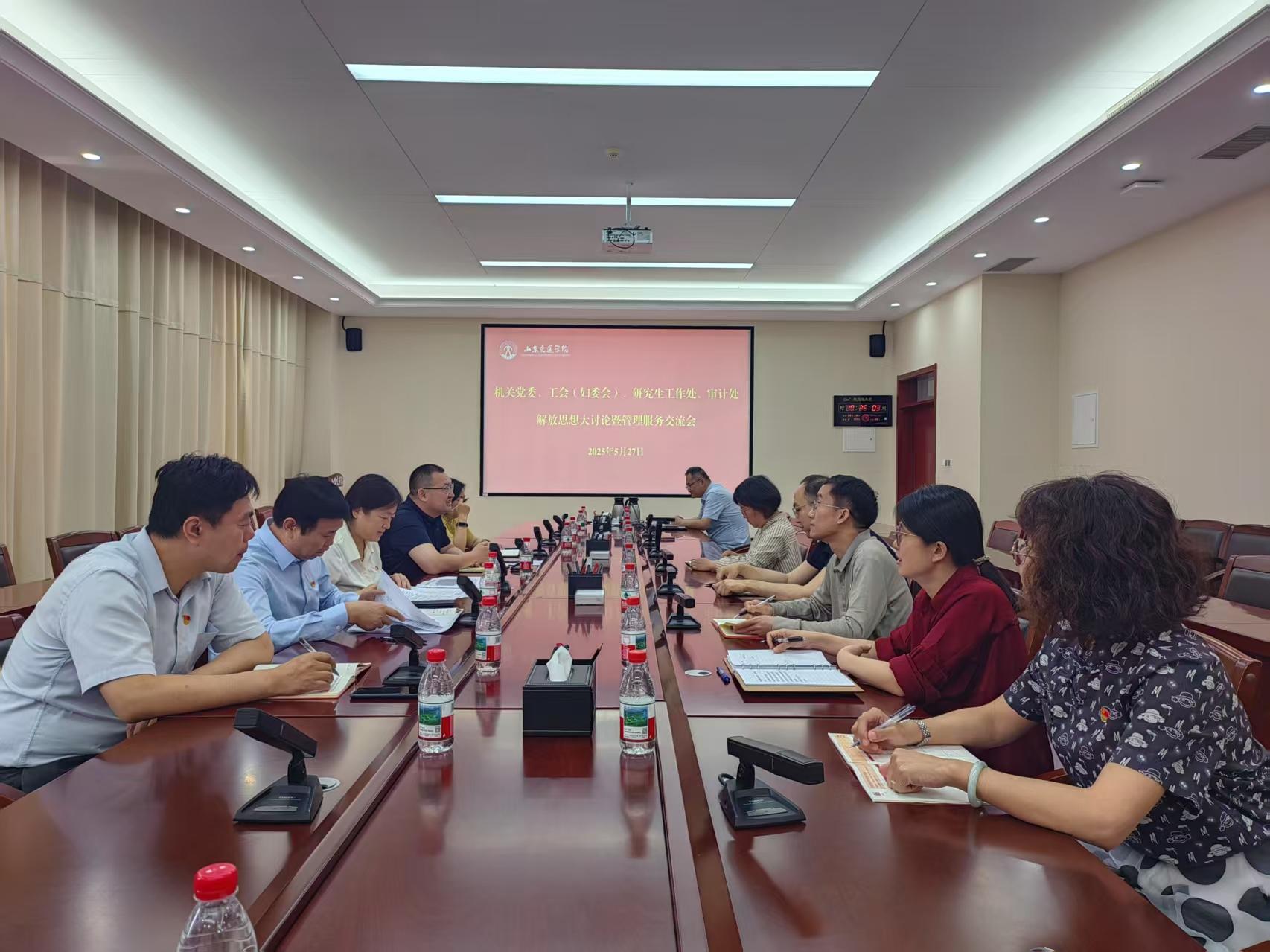 5月27日,工会(妇委会)、审计处、研究生工作处在明德楼301会议室联合召开解放思想大讨论暨管理服务交流会。会议由工会(妇委会)主席闫晓阳主持。