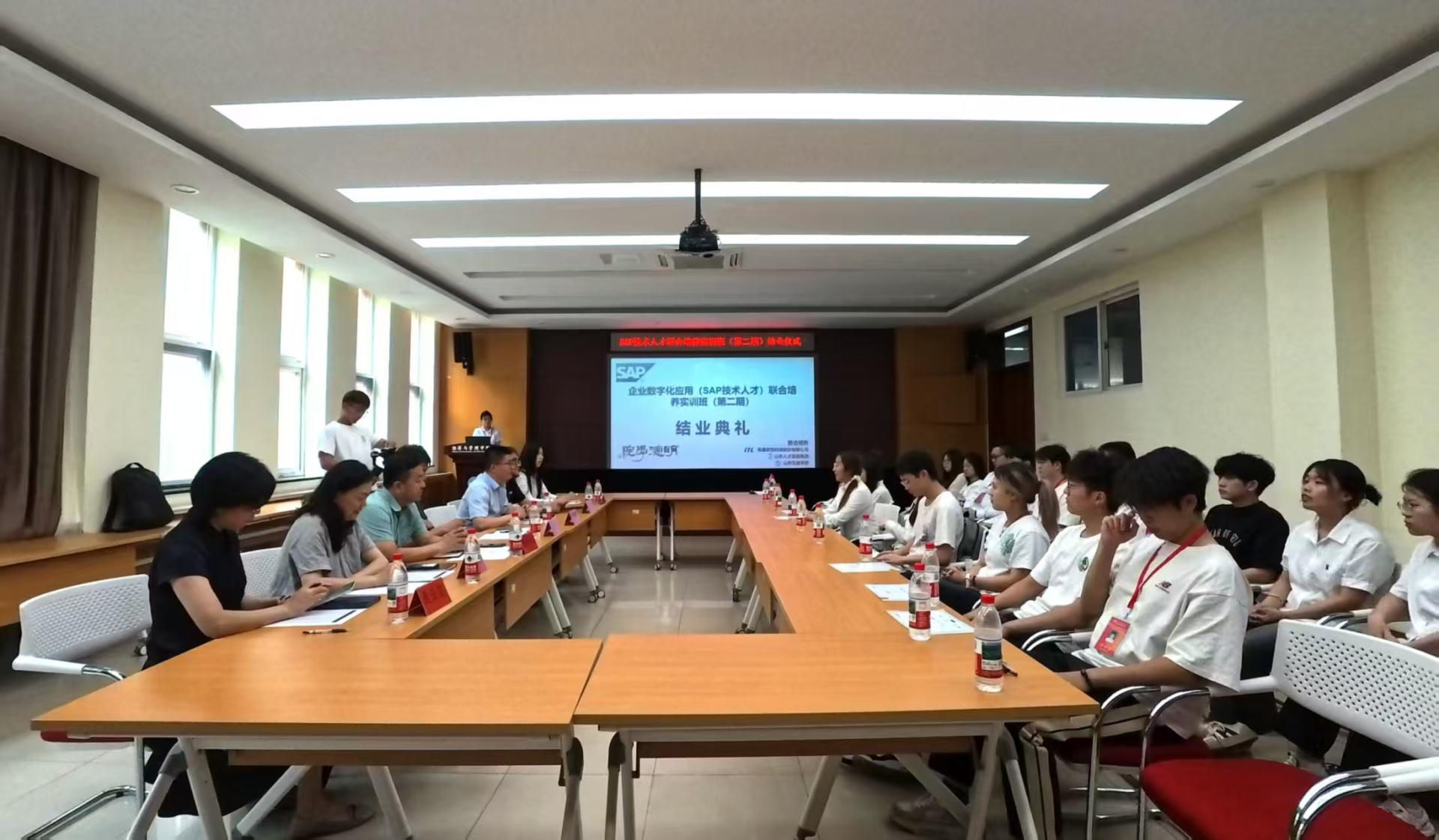 当天,经济与管理学院举办企业数字化应用(SAP技术人才)联合培养实训班(第二期)结业仪式,校企领导为参训学员颁发结业证书及SAP技术人才认证证书。来自山东建筑大学、齐鲁工业大学(山东省科学院)、山东管理学院等高校学员代表分享学习心得,均表示,要把学习内容转化为实践能力,立志成长为有能力、有担当、有眼界、有情怀的应用型数字人才,为区域经济社会高质量发展贡献力量。