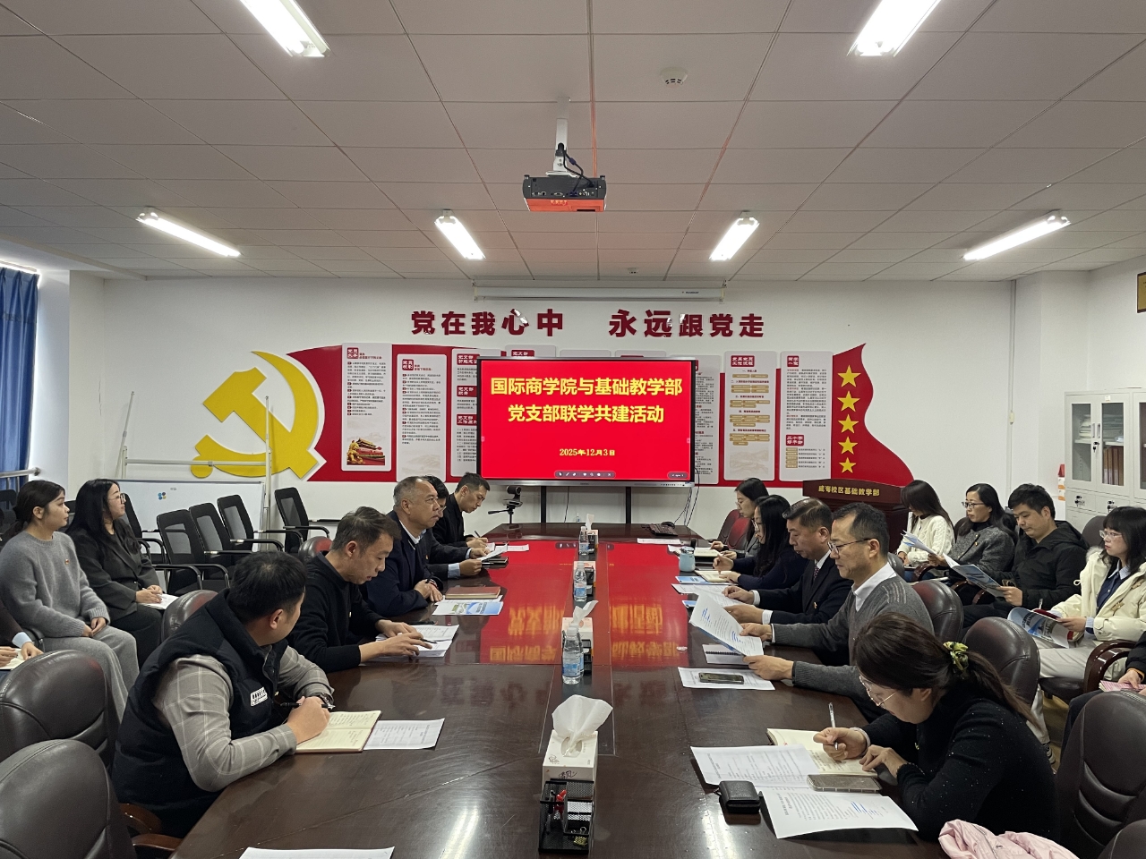12月3日,国际商学院与基础教学部在A405党员活动室共同举办“党建引领促融合,联学共建育新人”联学共建活动。