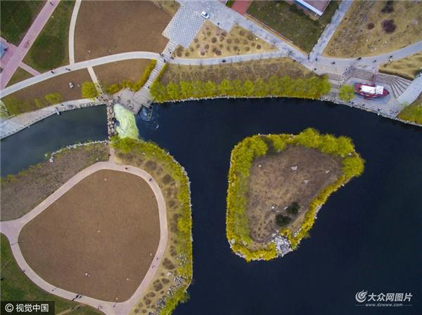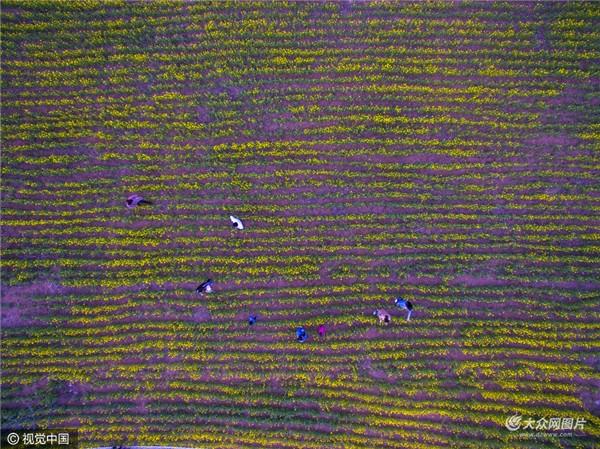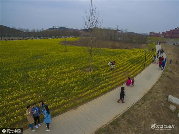 3月19日,济南,航拍山东交通学院长清校区百亩油菜花开,遍地花香,宛如“上帝”调色板。
