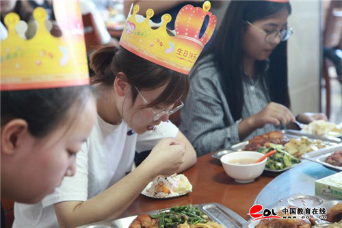 “同学们,祝你们生日快乐。”陈校长的一句话感动了在场的不少学生。原来,包括信息专业王渝,法学院王艺文,外国语学院林语嫣在内的七名新生今天同天生日,报道时学生处的工作人员专门留意了这个信息,特意给他们买了蛋糕,集体为他们过生日。“真的是个惊喜,在家里都没怎么过过生日,上大学了竟然还能过生日。”来自高密的学生王渝说,自己要打电话告诉爸爸妈妈,向他们述说这一喜悦,接下几年,自己一定会好好学习,回馈学校。