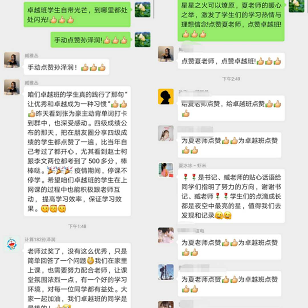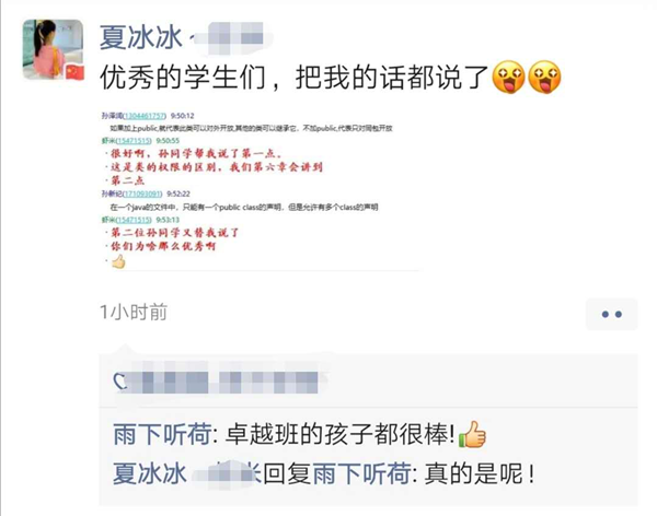 事情还要从夏老师的朋友圈说起。中午12点,刚刚下课的夏老师在朋友圈发了一张网络课堂教学视频截图,图中两名学生与老师积极互动,夏老师隔空夸赞:“优秀的学生们,把我的话都说了!还加了两个俏皮的表情。学院分党委副书记张玉霞看到了夏老师的朋友圈,由衷点赞,并把夏老师的朋友圈的截图发到相关学生——孙泽润所在卓越班学生群,辅导员臧老师积极呼应,对卓越班学生一贯的卓越表现由衷点赞!