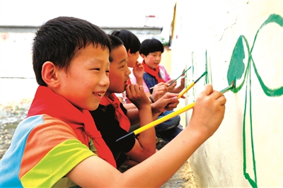 在大学生志愿者的带领下,喜爱绘画的代广硕(左一)和同学们一起绘制墙画,美化校园。从粉刷背景、勾画轮廓、填充颜料到亲手绘制,他在这个暑假实现了心中的小小画家梦,内心的喜悦写在脸上。
