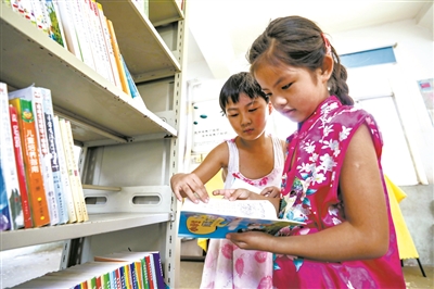 在山东交通学院实践志愿服务队为店台小学捐建的“希望书屋”里,赵娅雯(左)拉着小伙伴一起挑选喜欢的图书。爱看书、爱讲故事的赵娅雯,被同学们称为“故事大王”。