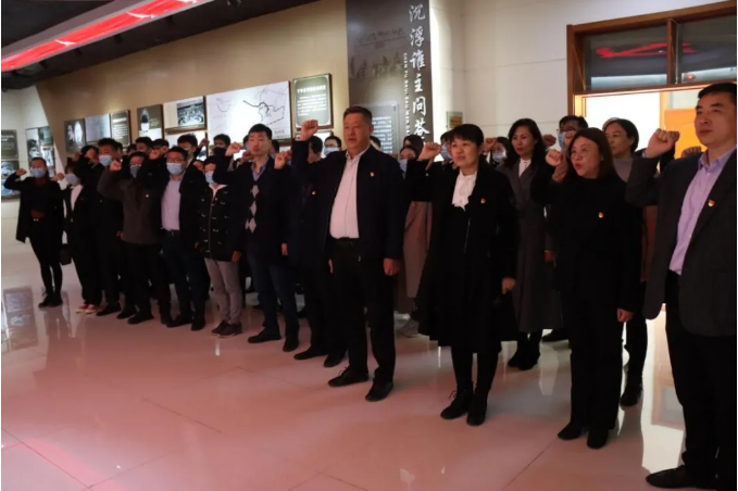 随后,师生党员们在陈松岩的带领下,面向王尽美烈士塑像重温入党誓词。