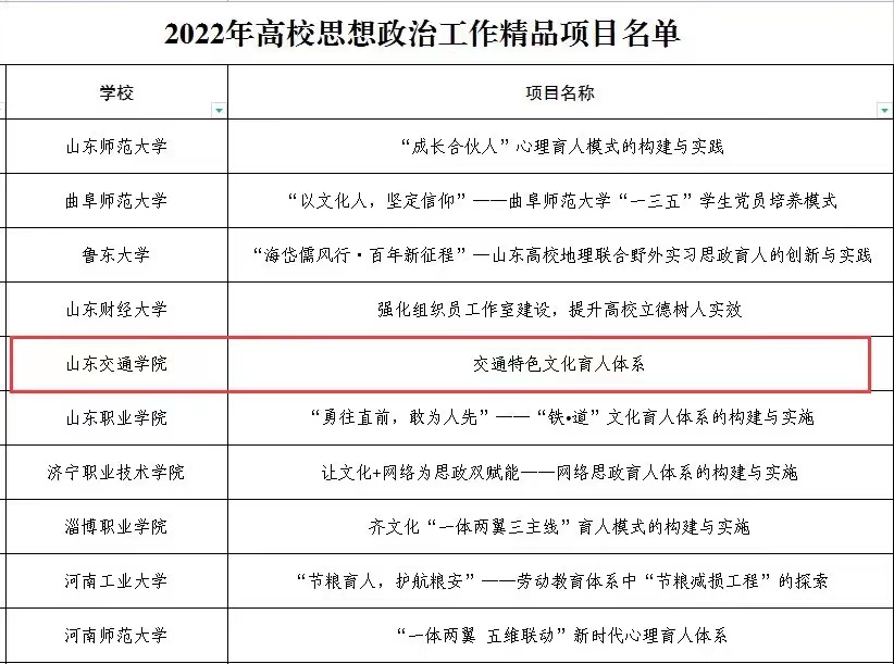 近期,教育部公示了2022年高校思想政治工作精品项目名单,全国共评出100个,山东交通学院申报的《交通特色文化育人体系》项目成功入选。
