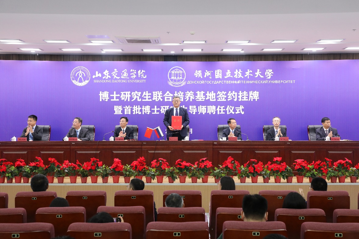6月8日下午,山东交通学院顿河学院博士联合培养基地签约、挂牌仪式暨首批博士生导师聘任仪式在山东交通学院长清校区举行。山东交通学院院长陈松岩与顿河国立技术大学校长梅什西·别萨里昂·乔霍耶维奇出席仪式并代表双方签署合作协议。
