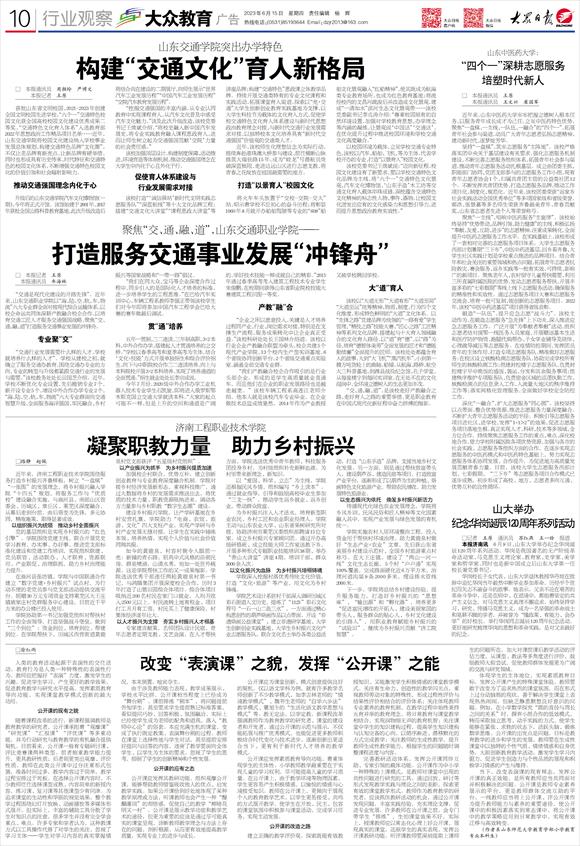 获批山东省文明校园、2021-2023年创建全国文明校园先进学校,“六个一”交通特色校园文化获全国高校校园文化建设优秀成果二等奖,“交通特色文化育人体系”入选教育部2022年思想政治工作精品项目名单……近年,山东交通学院将校园文化建设纳入学校事业发展总体规划,构建交通特色品牌“文化圈”,不仅让老品牌有新亮点,让新品牌有硬举措,同时也形成具有历史传承、时代特征和交通特色的校园文化体系,不断增强交通特色校园文化的价值引领和社会辐射影响力。