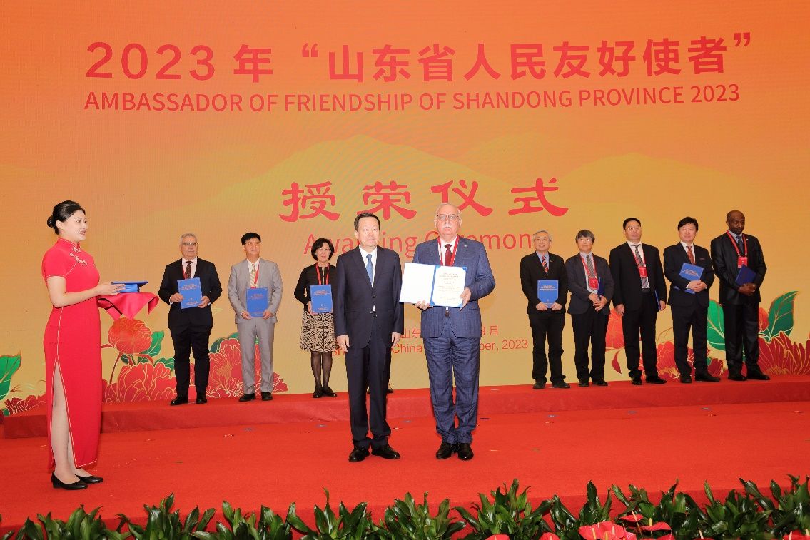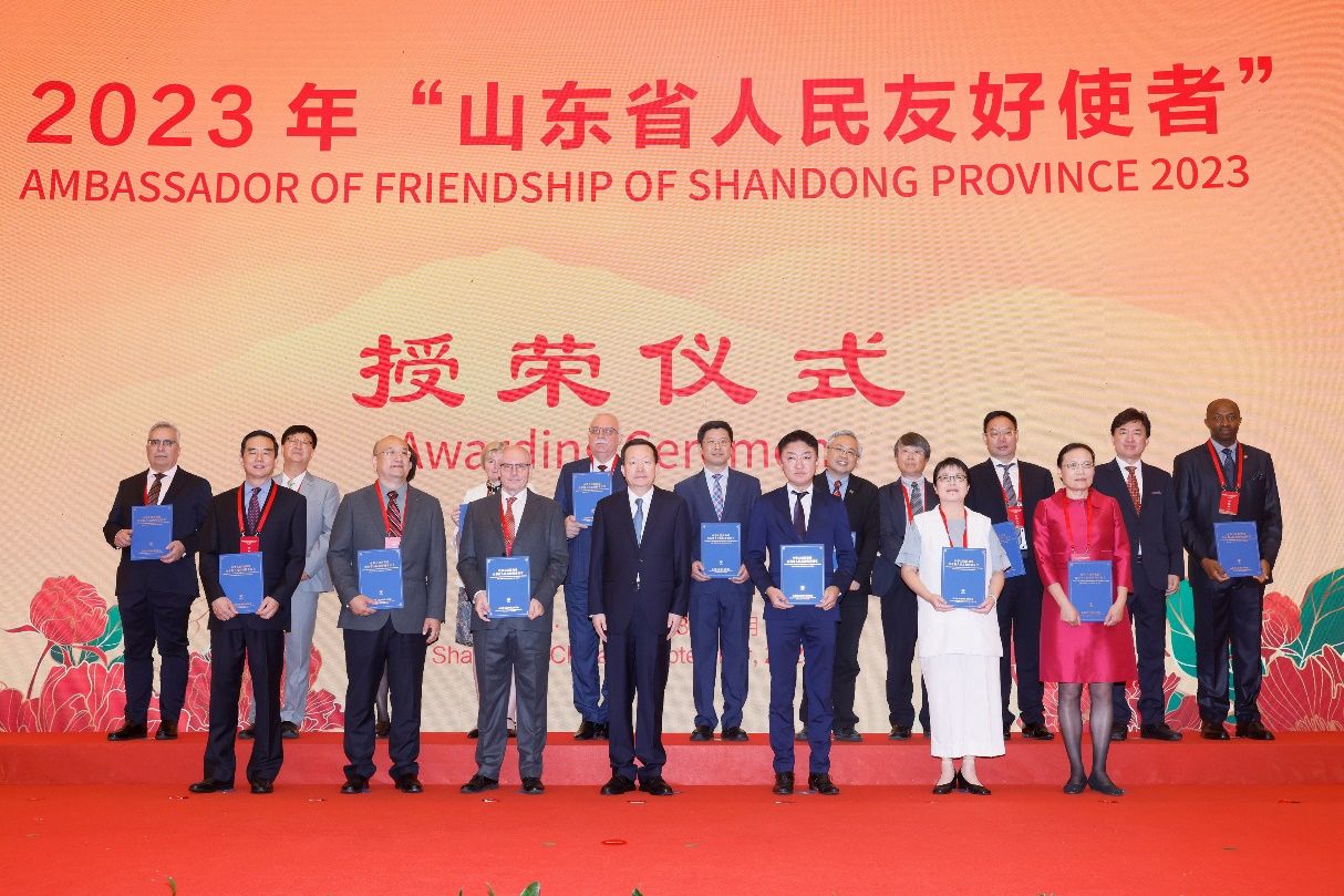 9月28日下午,山东省人民政府在山东大厦金色大厅举行国庆招待会,庆祝中华人民共和国成立74周年。招待会上,宣读了2023年“山东省人民友好使者”授予决定,授予山东交通学院外方合作大学校长梅什西·贝西克等42人“山东省人民友好使者”称号。