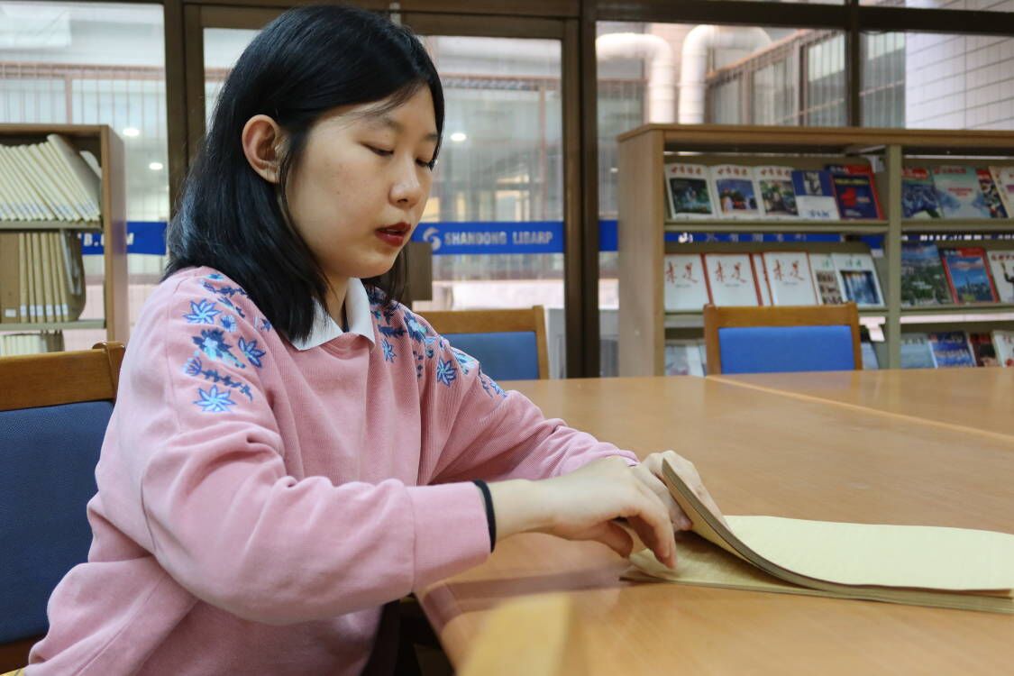 12月6日上午,在山东省图书馆的无障碍阅览室里,一位年轻姑娘正在整理书架上的书籍。她留着披肩长发,干净清爽的面庞、休闲整洁的衣裳,看上去与其他女孩无异。但仔细观察你会发现,她的眼神有些低垂,手里的工作更多是靠摸索。
