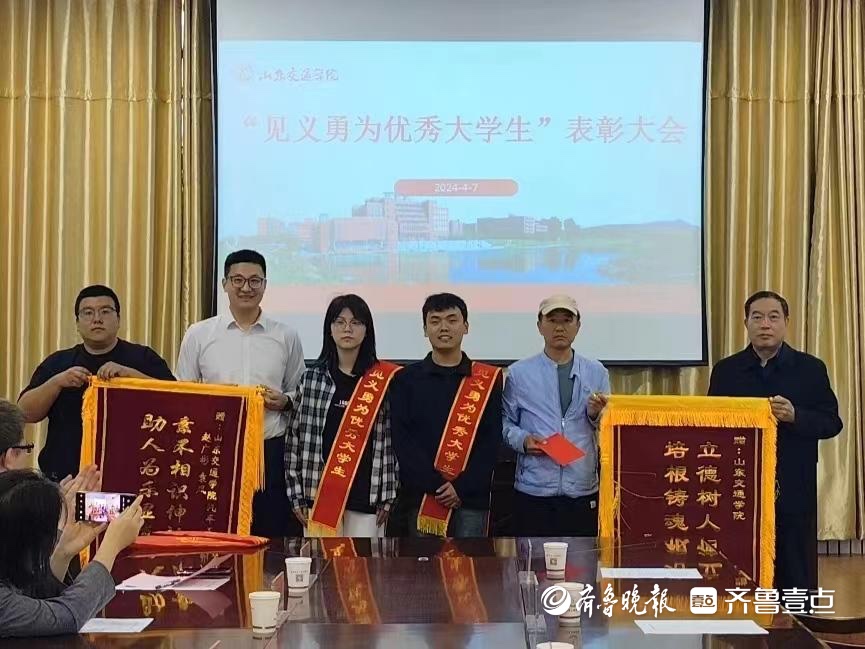 4月6日,齐鲁晚报·齐鲁壹点以《悦读大学|观光车掉湖里,大学生救完83岁老人,又救下父子俩》(点击回顾事情经过)为题,报道了山东交通学院大二学生赵广彬、袁凤见义勇为的行为,相关报道随即登上济南同城热搜榜,引发社会广泛关注。如今,这件事情有了温暖后续。7日,获救者张策和父亲张广敬来到山东交通学院,为学校及救人的学生送来了锦旗及感谢信。为表彰这两位同学的行为,山东交通学院决定授予二人“见义勇为优秀大学生”称号,并在全校范围内通报表扬。