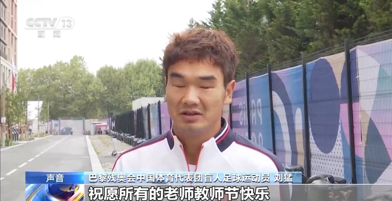 巴黎残奥会中国体育代表团盲人足球运动员 刘猛:祝愿我的老师,祝愿所有的老师教师节快乐,你们辛苦了。
