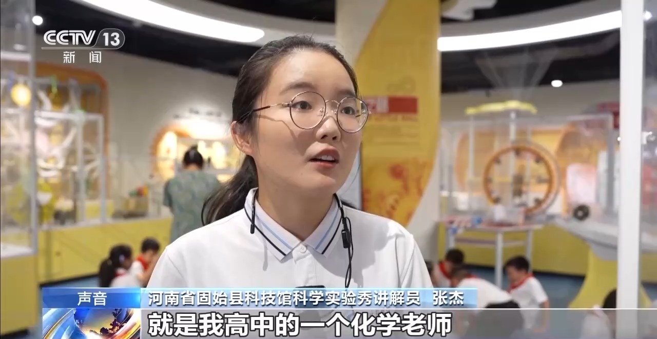 河南省固始县科技馆科学实验秀讲解员 张杰:我印象比较深刻的就是我高中的一个化学老师。当时我化学成绩不太好,但是他还是坚持让我去当化学课代表,以此为动力,就是让我对化学产生了一定的兴趣。在最近几年工作的过程当中,我有一次在小剧场表演实验秀的时候,发现他就在台下,他带着他的孩子(学生)来看我这个表演。我当时就觉得,他十几年前在教我,十几年后我又教他的学生,就是很难忘的一次经历吧。