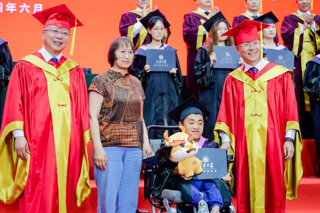 6月23日,山东大学2024届毕业典礼上,校党委书记任友群、校长李术才走下礼台,为坐在轮椅上的徐辰杰授予学位。徐辰杰现已推免至山东大学古代文学专业攻读硕士研究生。