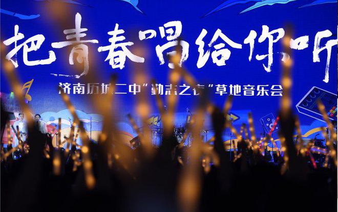 5月19日,历城二中举行“勤志之夜”草地音乐会。星空为幕,绿茵为席,万名师生共赴一场音乐盛宴。鹿先森乐队带领全场浪漫大合唱《春风十里》。