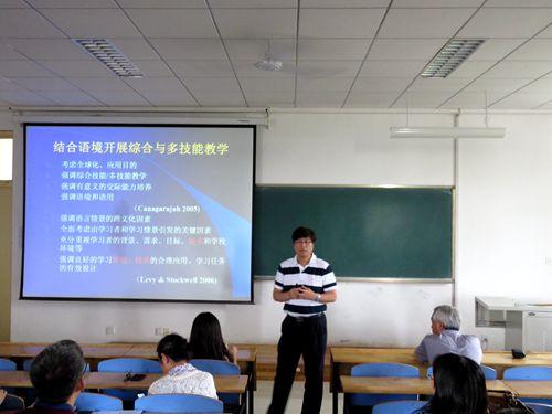 6月10日下午,上海外国语大学博士生导师、上海外语音像/上海电子出版社社长、国家级外语学术刊物《外语电化教学》副主编陈坚林教授,应邀在2号楼A302做了题为“外语教学研究发展趋势与外语教学改革”的学术讲座。我校外国语学院院长主持讲座,外国语学院全体教师聆听了讲座。