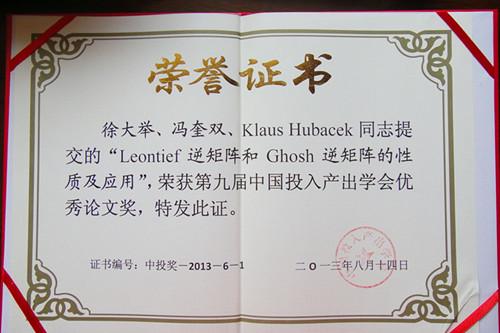 徐大举在马里兰大学访问学习期间,和马里兰大学地理科学学院的Klaus教授、Kuishuang Feng博士合作,共同开展了数学方法在环境投入产出分析中的应用研究,完成了两篇论文。其中题为“Leontief逆矩阵和Ghosh逆矩阵的性质及其应用(Properties of the Leontief inverse matrix and the Ghosh inverse matrix and their applications to comparative static analysis)”的论文在2013年8月12日至15日于广州召开的中国投入产出学会第九届年会上被评为优秀论文。会上,徐大举做了时长45分钟的学术报告,得到来自于人民大学、中国科学院、中国社科院和国家统计局的专家们的一致认可。获奖消息登载在马里兰大学地理科学学院的网页上,详情可点击 http://www.geog.umd.edu/content/chinese-visiting-scholar-drdaju-xu-and-dogs-researchers-drs-kuishuang-feng-and-klaus-hubacek