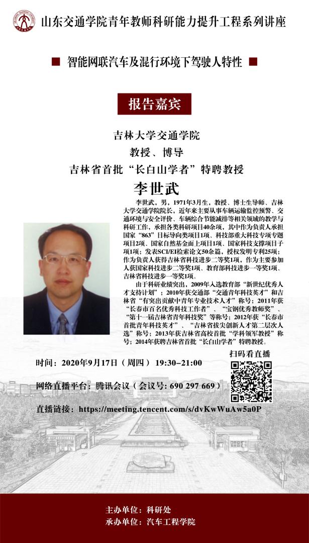 李世武,男,1971年3月生,教授、博士生导师、吉林大学交通学院院长,近年来主要从事车辆运输监控预警、交通环境与安全评价、车辆综合节能减排等相关领域的教学与科研工作,承担各类科研项目40余项,其中作为负责人承担国家“863”目标导向类项目1项、科技部重大科技专项专题项目2项、国家自然基金面上项目1项、国家科技支撑项目子项1项;发表SCI/EI检索论文50余篇,授权发明专利25项;作为负责人获得吉林省科技进步二等奖1项,作为主要参加人获国家科技进步二等奖1项、教育部科技进步一等奖1项、吉林省科技进步一等奖1项。