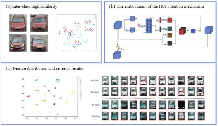 车辆重识别是人工智能及计算机视觉研究领域下的一个重要研究问题,旨在实现跨摄像头跨场景下车辆的自动识别与检索。本项研究工作提出了一种异质上下文交互注意力机制,在增强注意力学习的效果的同时,降低了注意力建模的计算复杂度。基于此注意力机制,该工作设计了一个异质上下文交互网络,可以有效解决车辆重识别中的类间高相似性挑战。
