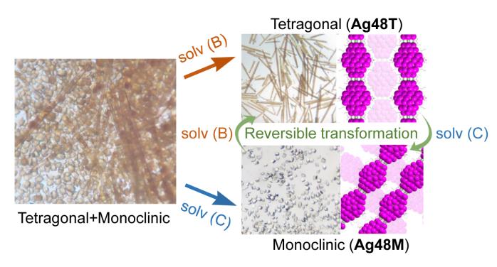 同质异晶化合物化学组成相同但结构不同,通常表现出截然不同的性能,如发光(光电器件)、颜色(颜料)、生物活性(医药或农药)和能量(含能材料)等,在材料科学、化学、生物医学、军事及航空航天等领域具有重要应用价值。然而由于目前对该现象的理解非常有限,用于控制结晶过程以实现不同晶型的分离并选择性地获得所需单一晶型,仍然具有较大挑战性。本文提出了一种普适性的溶剂介导的合成策略,成功实现了首例银簇基超分子同质异晶化合物的不同晶型之间的分离提纯及可逆转化。
