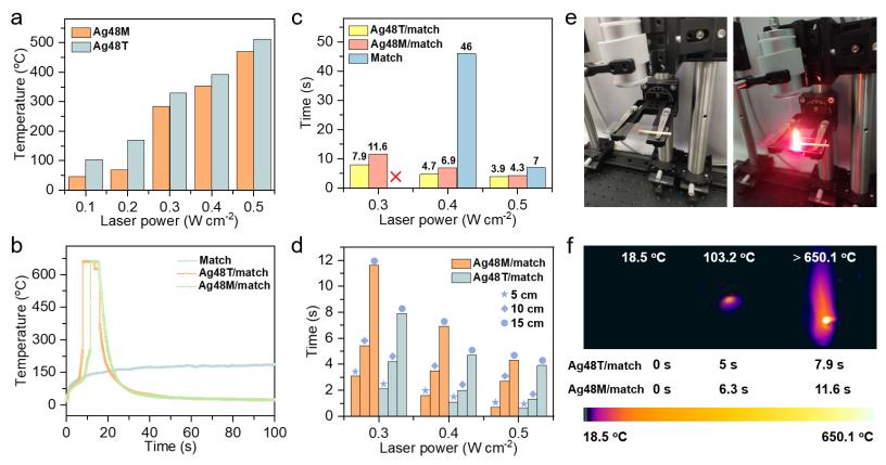 荧光猝灭可有效促进光热转化效率,化合物较低的室温荧光量子效率和聚集诱导猝灭(ACQ)现象大大提升了其光热效应。化合物在0.5 W·cm-2的660 nm激光辐照下,不到3秒即可从室温升到512oC,升温速率高达163oC·S-1,远超大部分已报道光热转化材料。本论文将该材料这一优异性能用于远程可控激光点火研究,为其在航空航天领域进一步应用提供了重要参考。