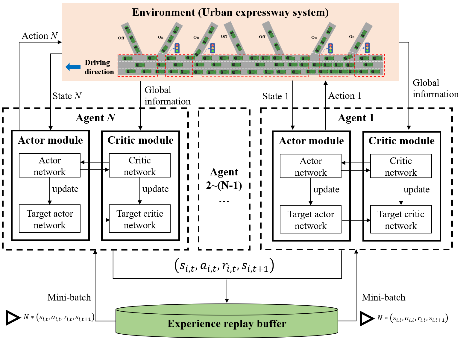 近年来,交通出行需求的持续增长导致城市快速路交通拥堵愈发呈现严重化和常态化的趋势,引发交通安全、交通污染等系列问题。入口匝道协调控制是一项行之有效的缓解城市快速路拥堵的管控措施,但仍在瓶颈辨识、控制对象选择以及控制方法建模等层面存在一些局限性。该研究利用车辆身份检测(Automatic Vehicle Identification,AVI)数据全量轨迹、OD等细粒度信息,针对复杂的城市快速路多瓶颈场景,构建了多智能体马尔科夫博弈模型,并设计了兼顾系统效率与入口匝道间公平性的奖励函数,采用多智能体深度强化学习算法进行了高效求解。本项工作丰富了匝道协调控制策略与方法,将有助于提升对AVI数据的获取、处理以及应用能力,同时将有效助力城市快速路交通运行效率的提升。