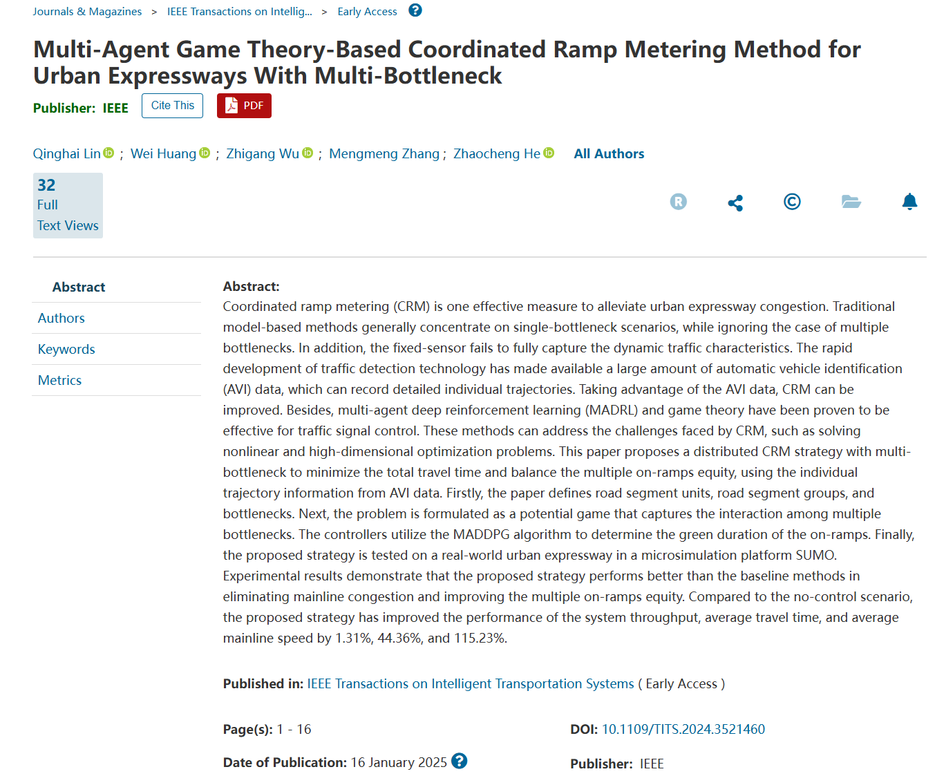近日,我校交通与物流工程学院教师蔺庆海以第一作者身份在智能交通系统领域国际知名期刊《IEEE Transactions on Intelligent Transportation Systems》发表题为“Multi-Agent Game Theory-Based Coordinated Ramp Metering Method for Urban Expressways With Multi-Bottleneck”的研究论文。该论文的合作作者包括中山大学何兆成教授、黄玮教授、武智刚博士以及我校交通与物流工程学院张萌萌教授,山东交通学院交通与物流工程学院为第一完成单位。该研究依托国家重点研发计划项目《自主式交通系统计算技术》、山东省自然科学基金项目《多源异构数据融合下的城市快速路匝道协调控制优化》等展开。