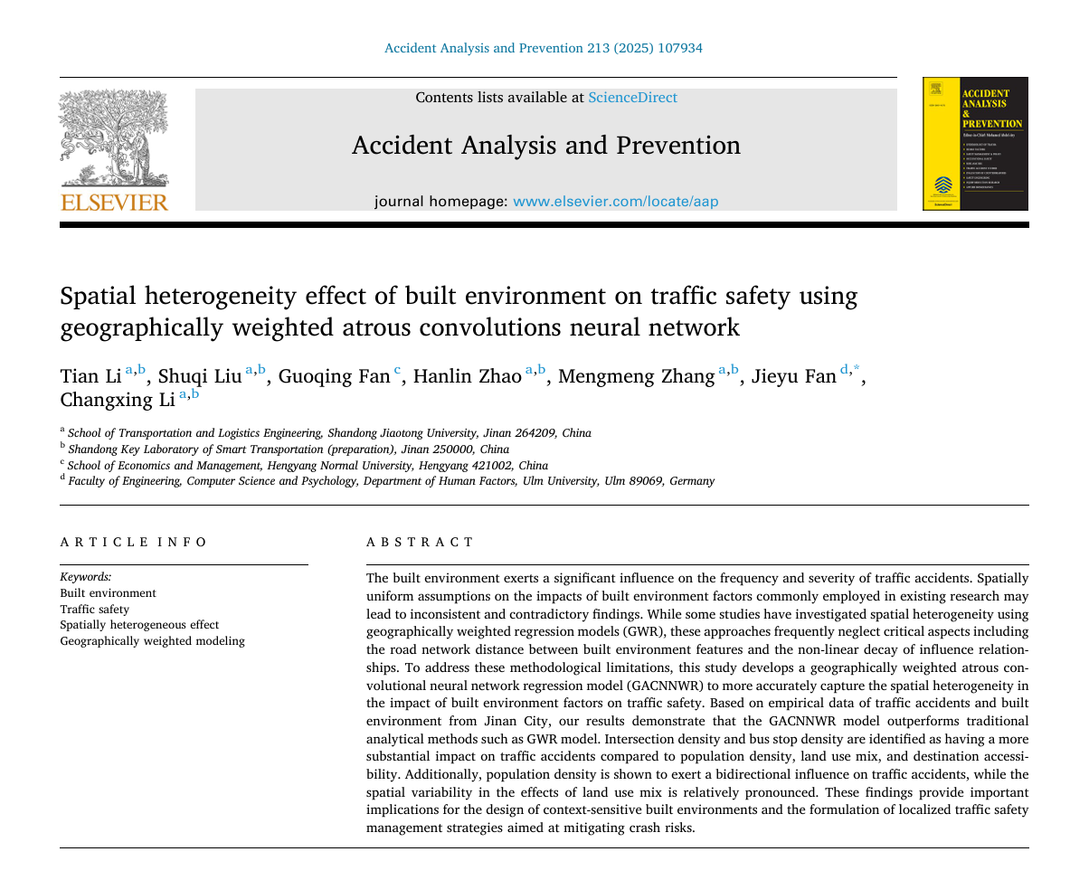 近日,我校交通与物流工程学院教师李甜以第一作者身份在交通安全领域国际知名期刊《Accident Analysis and Prevention》发表题为“Spatial heterogeneity effect of built environment on traffic safety using geographically weighted atrous convolutions neural network”的研究论文。该论文的合作作者包括我校交通与物流工程学院张萌萌教授与研究生刘淑琪、赵瀚林等,山东交通学院交通与物流工程学院为第一完成单位。该研究得到济南市高等学校自主创新团队项目(项目编号20233040)和山东省社会科学规划项目(项目编号24DGLJ25)资助。