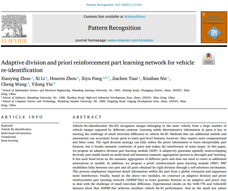 近日,我校信息科学与电气工程学院(人工智能学院)2022级硕士研究生周晓颖同学在庞希愚副教授指导下以第一作者身份在人工智能国际顶级期刊Pattern Recognition上发表题为“Adaptive division and priori reinforcement part learning network for vehicle re-identification”的学术论文。