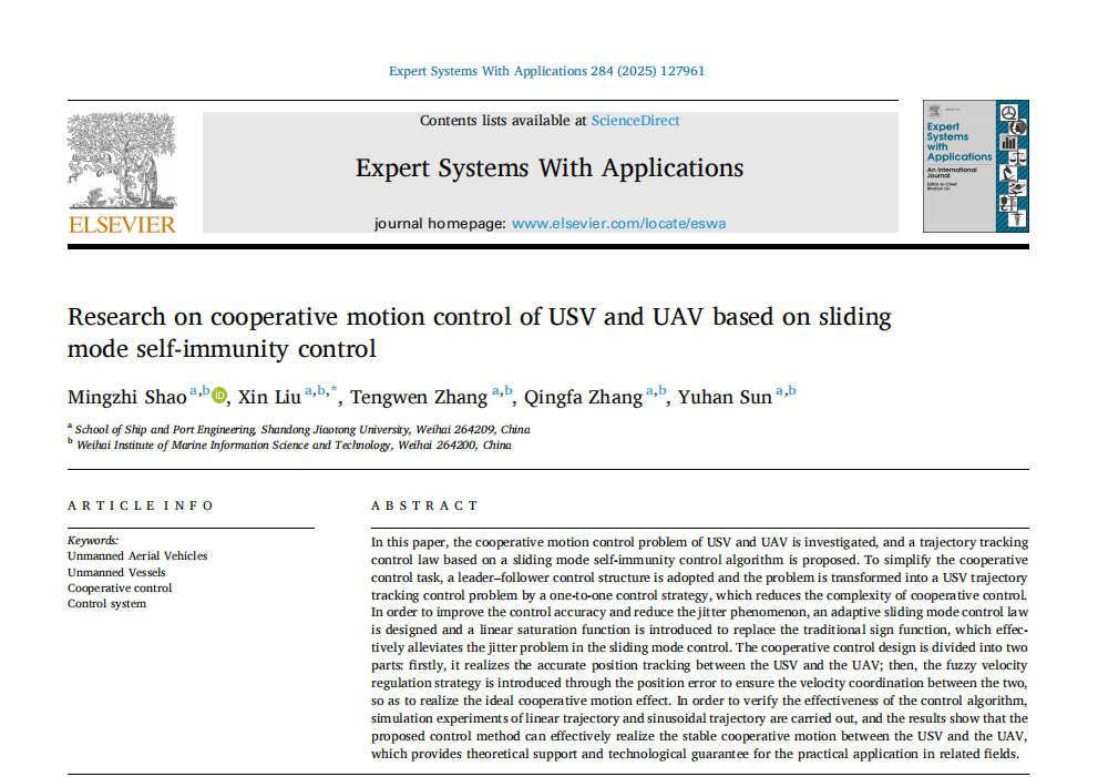 近日,我校船舶与港口工程学院2023级硕士研究生邵明智同学在刘鑫副教授的指导下,以第一作者身份在人工智能领域的国际顶级期刊《Expert Systems With Applications》上发表了题为《Research on Cooperative Motion Control of USV and UAV Based on Sliding Mode Self-Immunity Control》的学术论文。