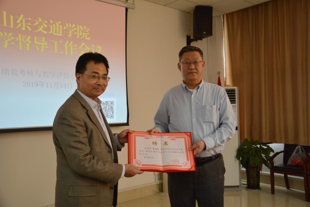 陈松岩向到会的校级教学督导员颁发聘任证书,勉励大家不忘教育初心,牢记育人使命,用丰富的教学经验为提高学校教育教学质量贡献力量。